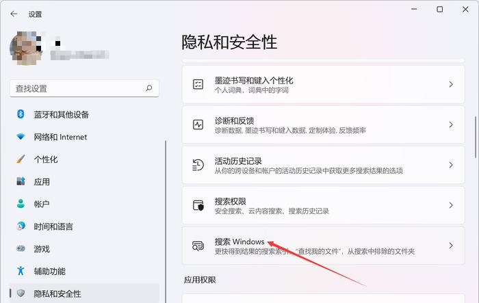 保护 Windows 搜索, 输入 Windows 设置, 浏览到 [隐私和安全] 标签, 然后单击 [搜索 Windows] 选项 。