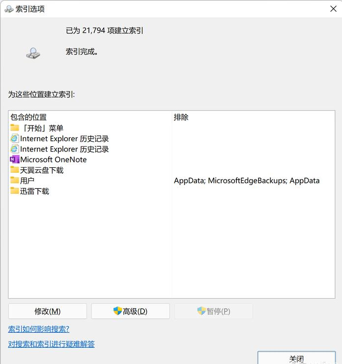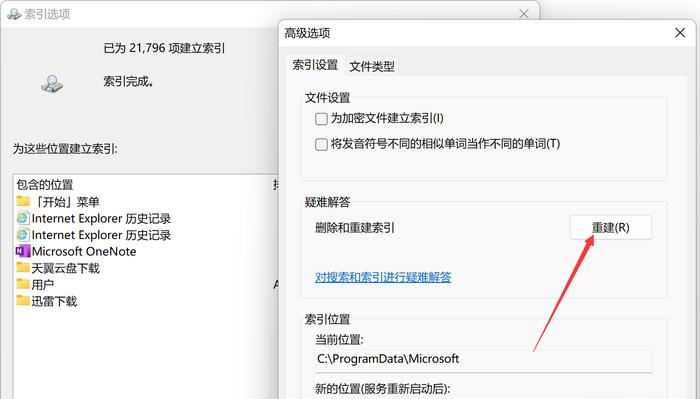 最后,返回到 [index] 选项窗口并单击界面下的 [高级] 选项按钮。单击弹出式高级选项窗口中的 [重建] 按钮后,将重建系统搜索索引,并应用新的设置。