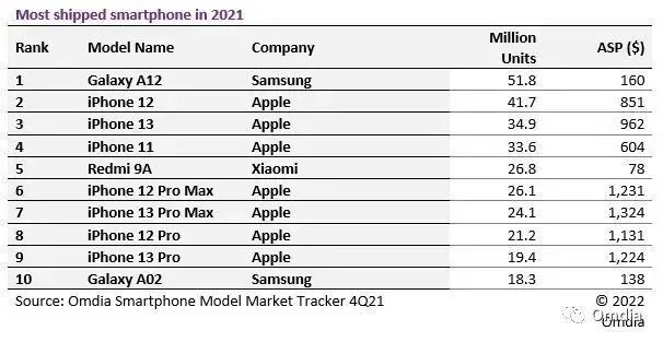 数据显示,去年,最佳销售模式是三星银河系统A12。销售总数为5 180万。每年有超过五千万台电脑 为三星的首批货物出售iPhone 12排名第二iPhone 13: 349万是销售量第三高的。整个10公里长的托普苹果需要七个席位。三星2款,Redmi 9A排在第五位