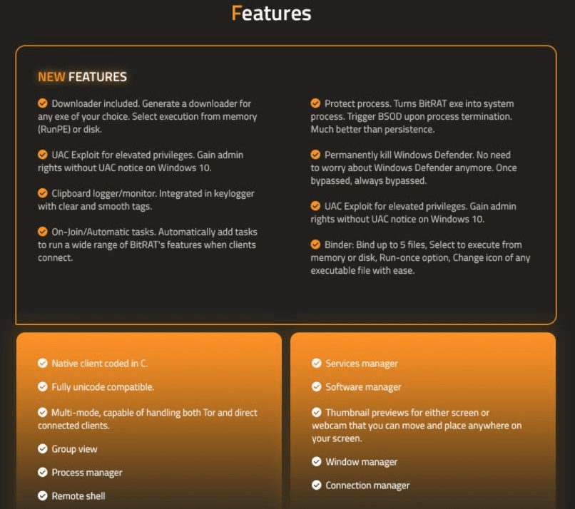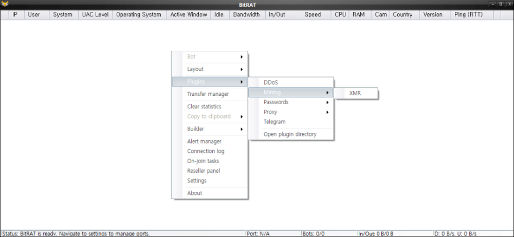 因为Bitrat是RAT恶意软件因此,其攻击者完全控制了被其感染的机器。BitRT不仅提供基本的控制功能,例如运行中的流程活动、服务任务、文件任务、远程命令等等。还有其他可能发生信息盗窃功能,如HVNC、远程桌面、硬币开采、代理等等。