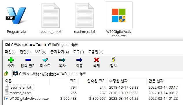 “W10DigitalAccession” SFX文件大小为7z。使用“ W10Digital Actionation” 的名称。 真正的 msi 认证程序叫做“ W10Digital Actionation_ Temp ” 。 Malware 被称为“ MSI ” 。当用户双击文件时,这两份文件将同时安装。由于恶意软件和认证工具同时运行,用户被欺骗,认为该方案运作正常。如下所示。