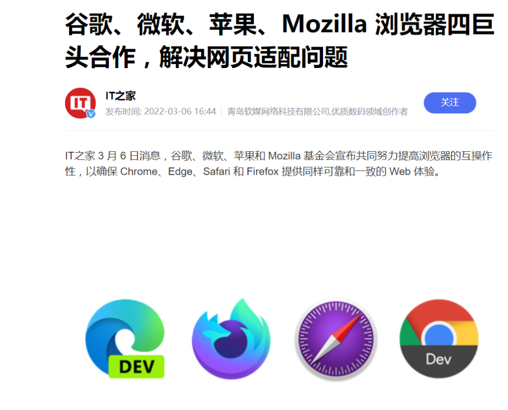 微软以前曾与苹果、谷歌和Mozilla联手, 指出需要统一网络电器, 让每页在不同的浏览器中显示类似的图片和文本比例。