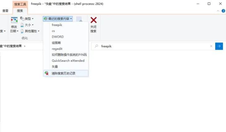 首先,我们启动资源管理。搜索时,在搜索字段中输入任何关键词。这将在资源管理器窗口中添加“ 搜索” 标签 。选择“ 最近搜索内容” 选项 。弹出式菜单显示新搜索的条款 。单击底部的“ 清洁搜索历史” 命令 。重要的话可以删除。