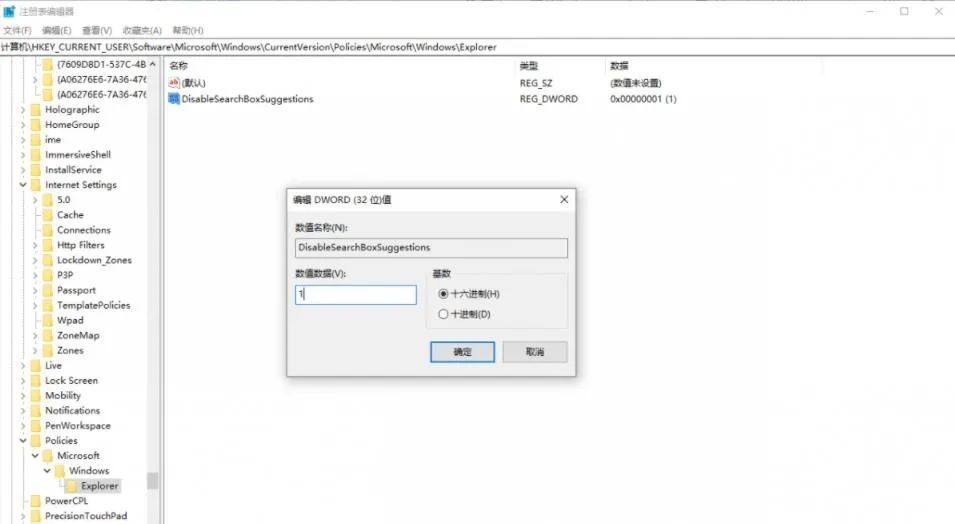 可禁用 SearchBoxSugbouts. double- 单击以打开新的 DWORD 值, 然后将值数据设置为 1. 关闭注册编辑器并重新启动系统 。