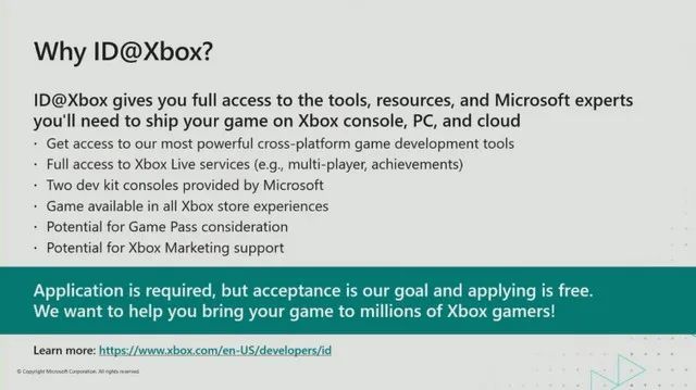 2013年,Xbox副总裁Phil Harrison介绍了所谓的ID@Xbox。微软的两套开发软件可以免费向报名参加该方案的开发商开放。您也可获取所有必要的技术材料。程序释放游戏还允许访问Xbox One和Xbox Life的所有部件。该项目的创建者也可以使用Unity引擎。相反,您可以通过订阅服务使用假引擎4。应用到 ID@Xbox, 提交游戏认证, 并接收自由发布或更新 。
