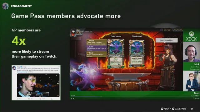 在Xbox平台上,普通玩家比普通玩家更有可能成为游戏通过用户 。我还想和我的朋友和队友分享游戏的内容"Game通行证订户和其他玩家一样 得到三倍的社会活动次数"与此同时,Game Pass的成员也比其他玩家在Twitch上直播的可能性高四倍。