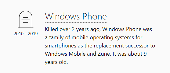 例如,Windows电话于2010年开始,并于2019年结束,作为微软设备的移动操作系统,并作为Windows Mobile和Zune的替代系统。