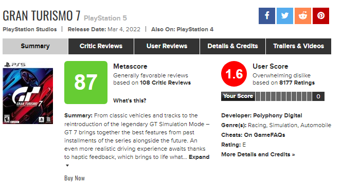 目前,GT7拥有索尼第一党任何一场比赛中最低的代谢用户评级。 3月25日下午,公布了一份官方的GT声明,声明它将纠正当前不满意的玩家经历,包括立即赔偿100万分,以及未来球场的球员利润增加。