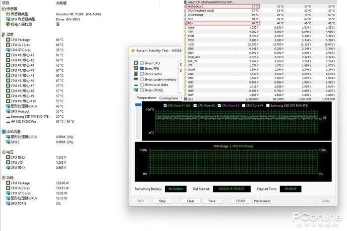 CPU在23度的房间温度下一次性烤制一小时,最后的CPU功率稳定在大约130瓦和P核频率4.5Ghz、E核频率3.4Ghz,主板传感器温度37度、PCH温度48度和CPU温度曲线。
