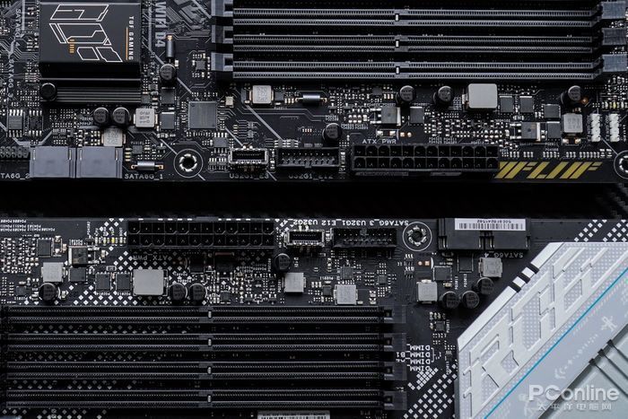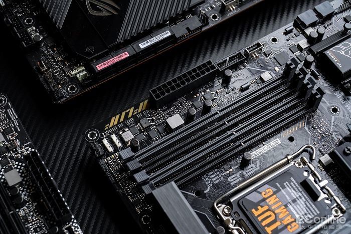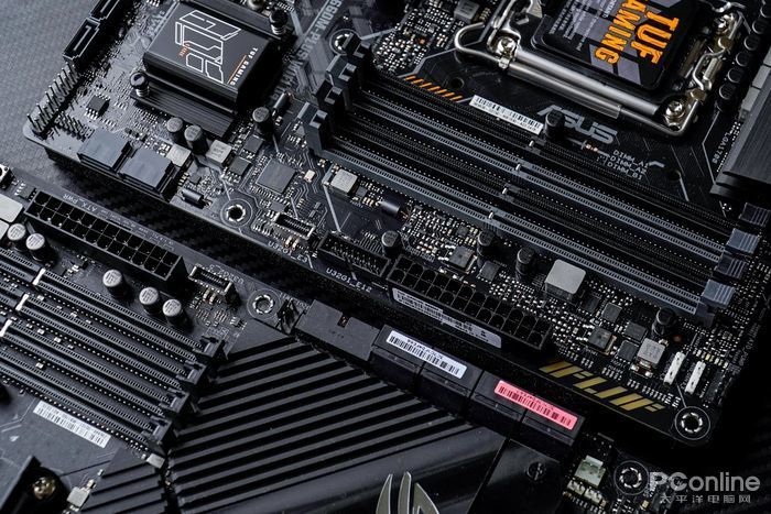 TUF的RGB光线Logo被描述为光线的黄豆,由24Pin电力供应接口加以补充。