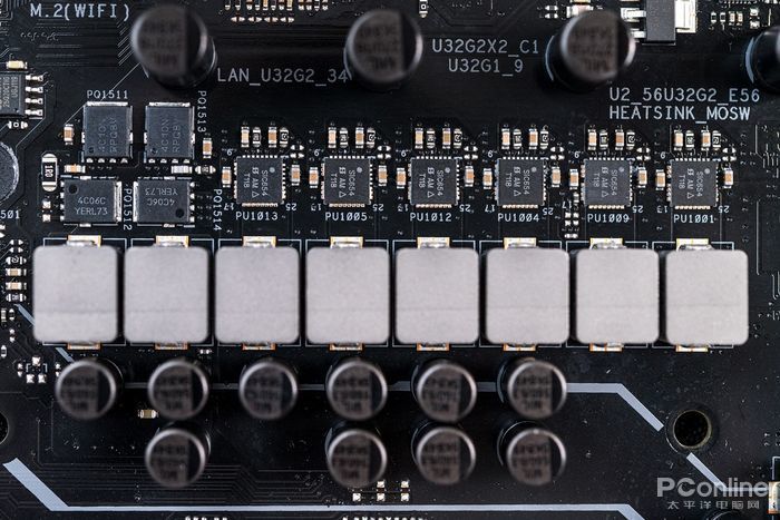 CPU的每个阶段都有威尔士半导体的SIC654 DrMos, 单一可持续输出为50A电流,使用一个将上桥和下桥合二为一的单一设计,通常用于中端和上端主板供电。