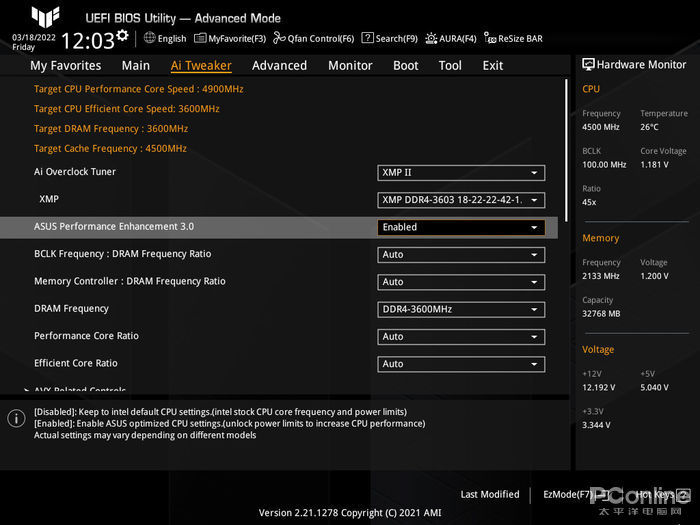 CPU将保留Gear 1模式,主面板仅以默认值35V提供一台电压,内存电压调整为1.4V,频率减至4-400,时间序列CL18。