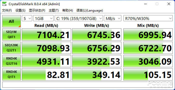 我们使用CrystalDiskmark软件来评估1GB硬盘的性能,因为该系统是由PCIE4.Zero固态硬盘驱动器驱动的。