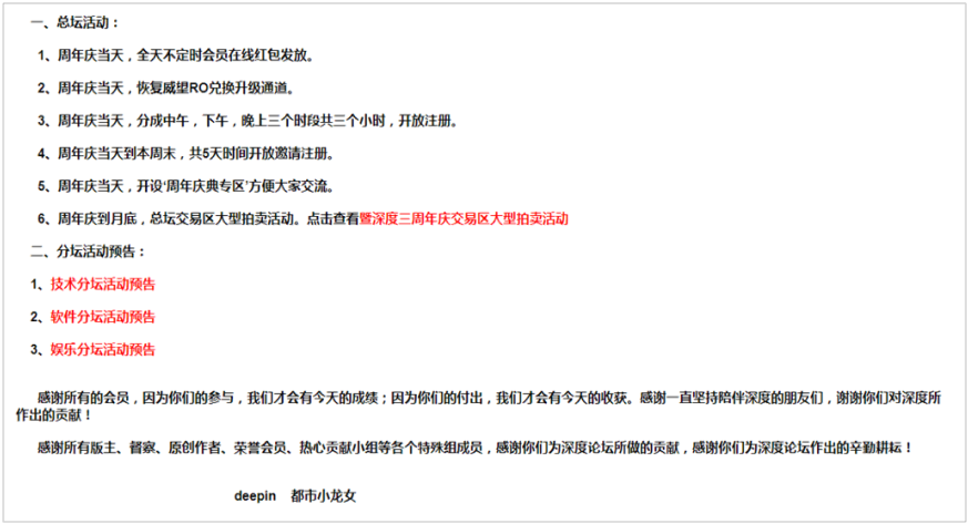 2007年2月份,将近240 00人已经参加本部论坛。网站变得丰富起来,你还记得城市里的女龙吗? 女龙, 春阳龙, 深处的论坛糖果,等等?在以论坛形式进行的设计竞赛中,"城市龙女"似乎突然出现这是创建深度样式模板的理想模式。还开发了许多插件。后来,深科技论坛的“城市龙女在深科技联盟的皮肤”运动导致了这个结果。为了配合联合国大会第17届会议,根据国家信息通报管理局适用的规定,详细来说,论坛新的用户登记被无限期关闭。改为邀请注册方式。