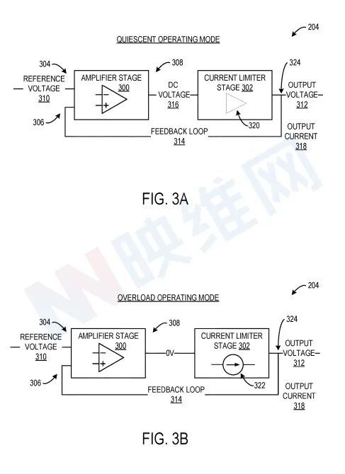 如图3B所示,对于过载操作模式,根据对放大300级的反馈,306当量的产出是门槛值当量的318倍。DC 316夹的零电压由300级放大器提供。当放大镜300级 目前的限值 302级 感应零电压在308,目前的302级限额用于从静态工作模式活动过渡到超负荷工作模式活动。在使用额外操作模式时目前的302级限值是目前的源322。电压调节器电路204的输出当前318夹也称为电流。目前的302级限值是目前的322个来源,可以将规定的电流调整到任何可接受的电流,以防止电压调节器发生电路204变坏。