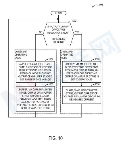 在1002,电压调控器电路的放大度反映电压调控器电路的电流是否大于阈值电流。如果产出当前值超过阈值当前值,此外,电路调节器的电路负担过重。100法被1008法所取代。否则,电压调节器电路在静态状态下运行。方法100被方法1004所取代。