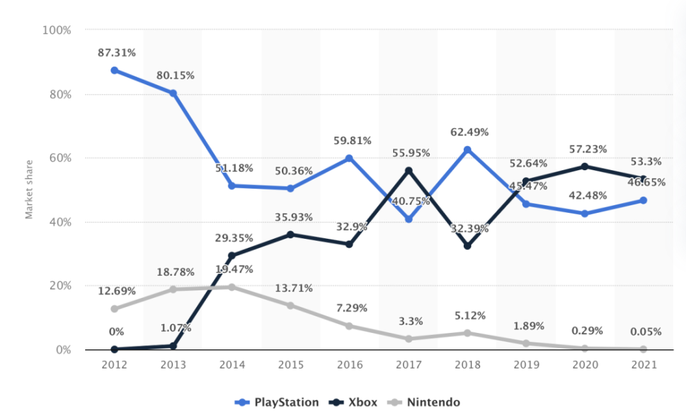 以美国市场为例,如下图所示,自2012年以来,游戏和Xbox产品的城市份额一直保持在80%以上。特别是从2017年到2021年,年复一年,两者的合并市场份额增加。约95%的原始价值已经保存。