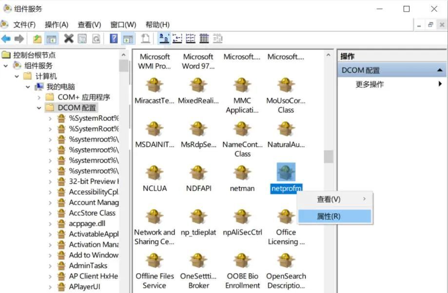 6. 向右拉动滚动条,在 Netprofm 上定位,单击鼠标右键,然后选择属性。