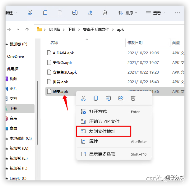 鼠标右键复制 Apk 文件的目录, 用 adb 安装命令安装 。