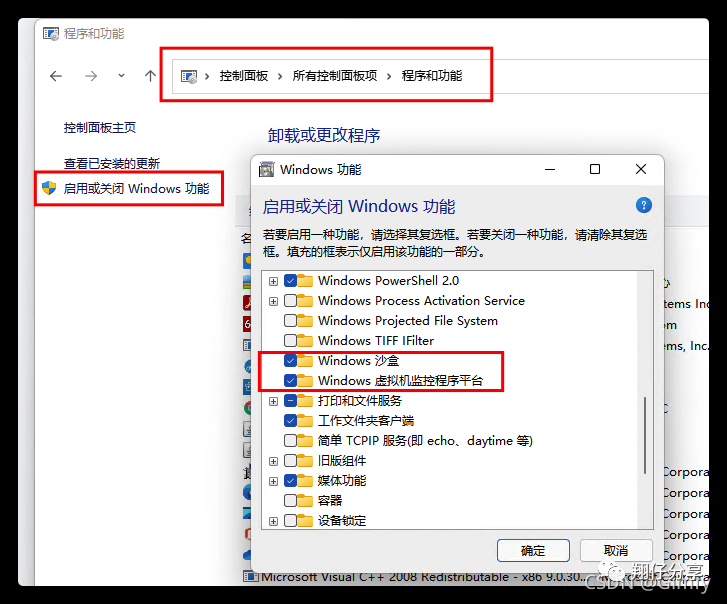 2 都启动了Windows Sandbox、Windows虚拟机器监测程序平台Hiper-V和虚拟机器平台。