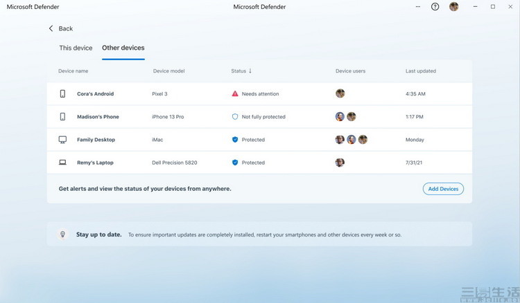 这个界面,你可以看到,就移动电话和平板电脑而言,微软维护者的预览版本可与移动版本应用程序连接。举个例子来说,如果你在父母的手机上安装微软维护者移动应用程序因此,当Ta在电话上点击欺诈性链接时,机器上预先安装的微软防御系统 将会被通知