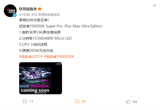 还是联想会整活!拯救者发布超酷炫笔记本:巨幅16K卷轴屏