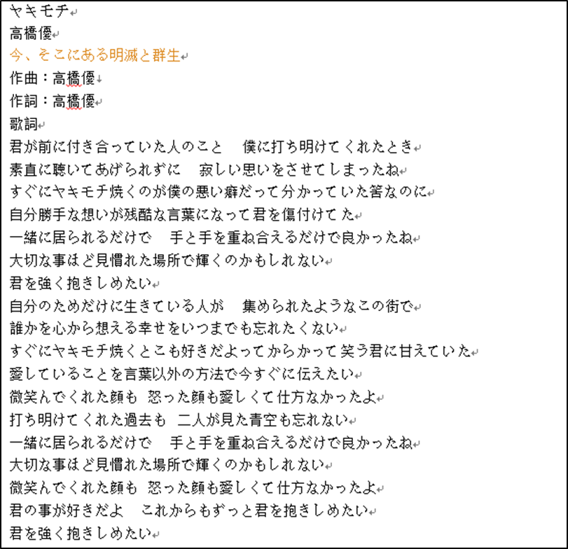 现在,我们已经提到,这里有一个链接 与高桥于的第十一首歌 从第四张专辑, "今日,公众的弃儿 ", " 心 " 。这首歌是由高桥于和唱家组成的。让我们看看这首歌的歌词和译文: