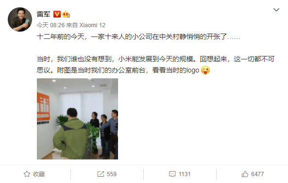 十二年前的今天, 一家由十几名员工组成的小公司 在市中心打开了门, 当时我们谁都没想到小米会长到现在的规模。 回顾过去, 这一切都是美妙的。 随附的人物是当时我们办公室的前台。 同时请看一下这个标志 。