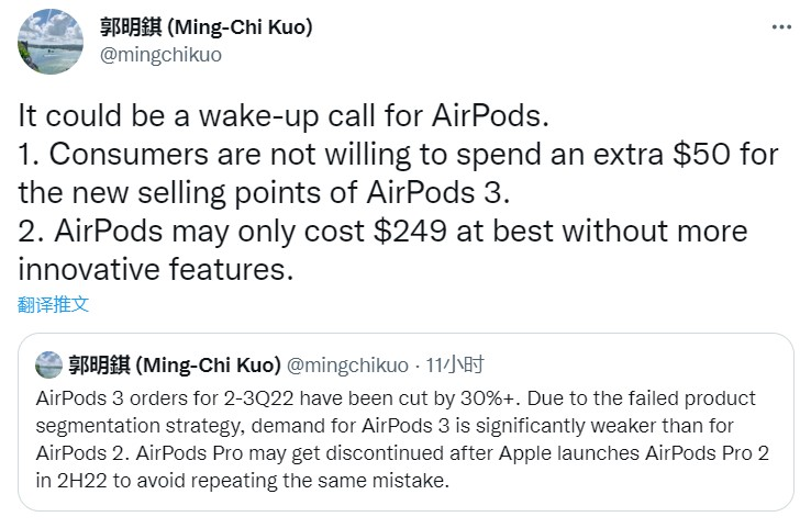 郭明Z还表示,由于产品分类战略失败,3号航班的需求量大大低于2号航班的需求量。在第二和第三季度之间,3号航空邮购单下降了30%以上。为了避免重蹈覆辙,苹果公司在今年下半年正式发布AirPods Pro 2无线耳机后,苹果公司将停止AirPods Pro。而对于 3号航班的需求量大大低于2号航班的需求量。郭明Z解释称,"消费者不想支付50美元以上 新的AirPods 3销售点。"如果没有更多的创造力,AirPods最多只能卖249美元