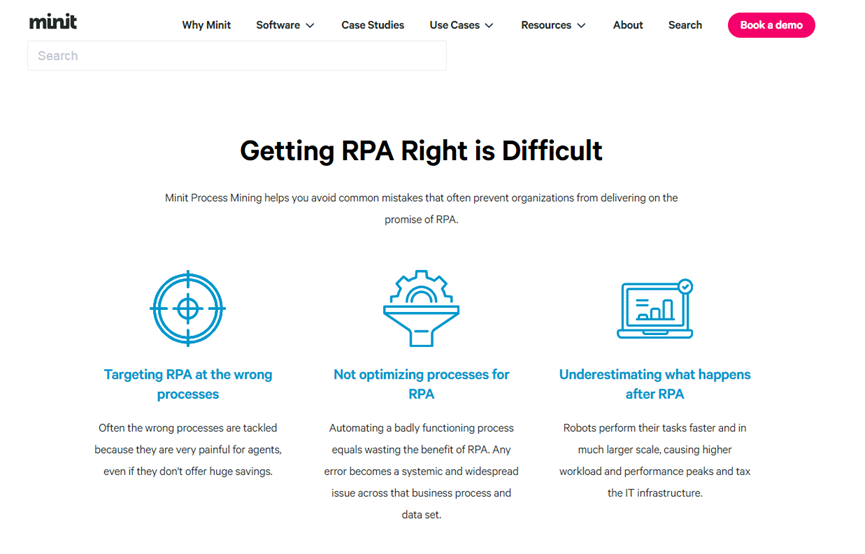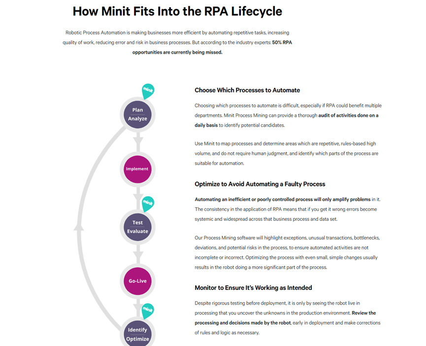 就RPA而言,过程采矿技术可以提供技术服务,以发现自动化可能性、自动程序监测、自动程序优化以及整个生命周期的机器人效率评价。