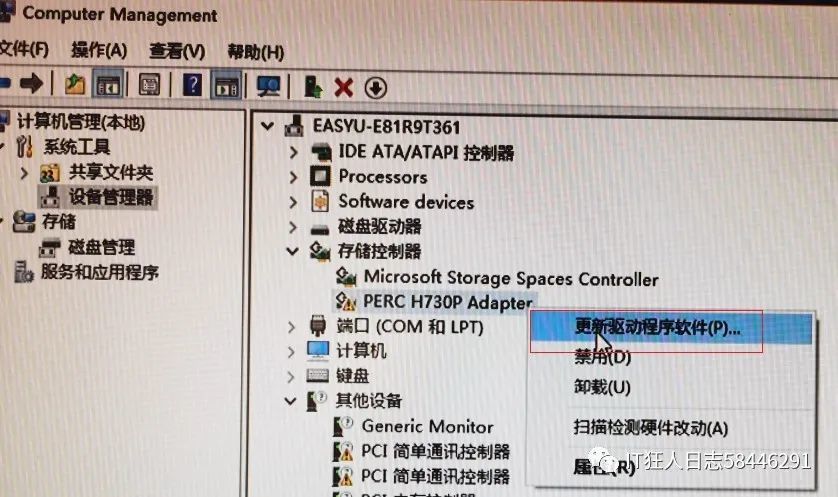 4. 在进入WINPE系统后,打开计算机管理并更新设备管理员的阵列卡驱动器。