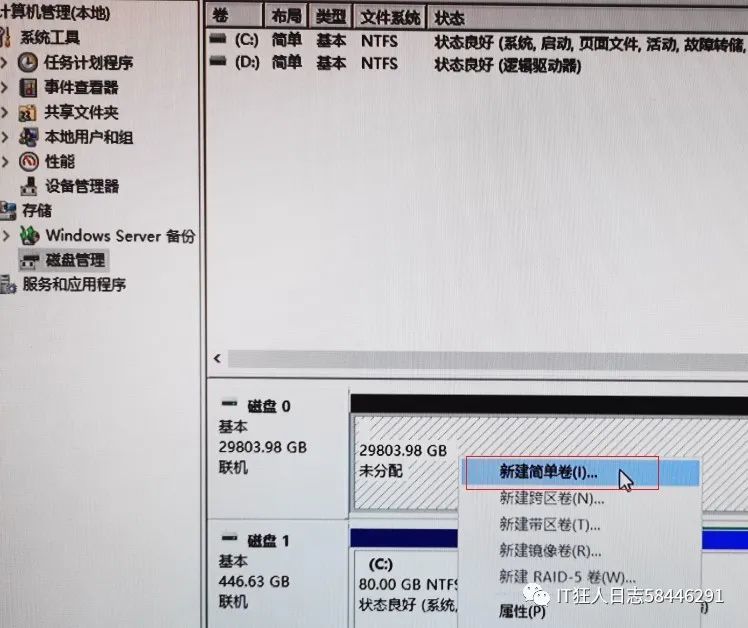 WinPE 安装完成后, 服务器将重新启动, 并将很快访问桌面。 第一步是从计算机管理中启动磁盘管理。 当检测到一个不活动的磁盘时, 系统将自动选择 GPT 分区激活 。