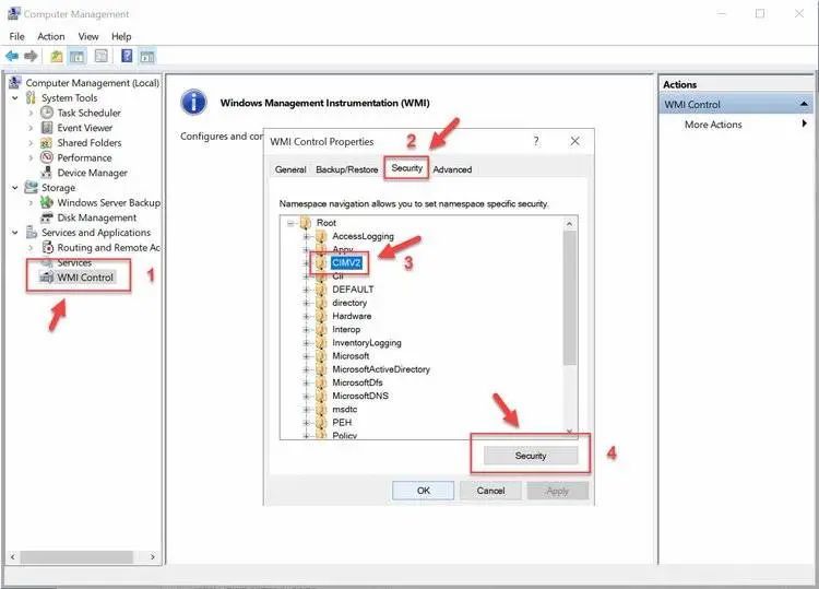 WMI控制MMC或计算机管理MMC开放,并显示WMI控制属性。