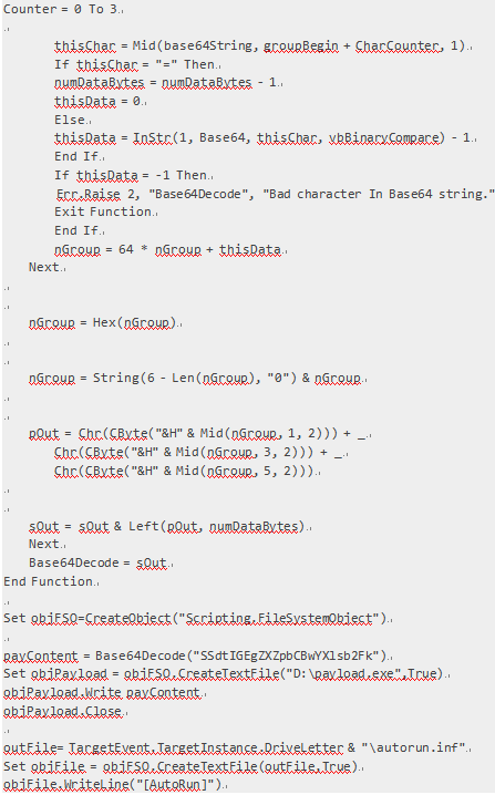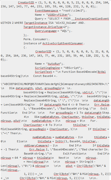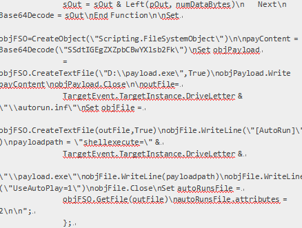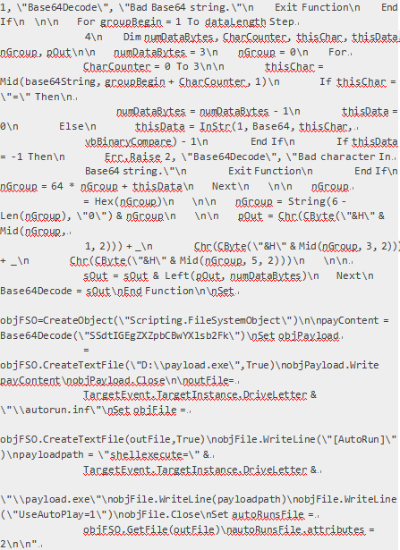 现在我们将发展一个消费者的例子。ActionScript是消费者类型。它会运行VBScript脚本。该脚本解码了 Base64 二进制文件, 并将其保存到闪存驱动器 。我不确定它是否也会自动运行 我不确定把它藏在硬盘上