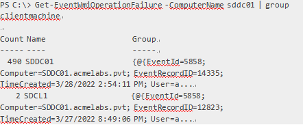 我们可以使用ClieentMachine小组从其他主机中搜索远程主机的活动。 在这个例子中,我们可以看到SDCL1有两个操作问题。