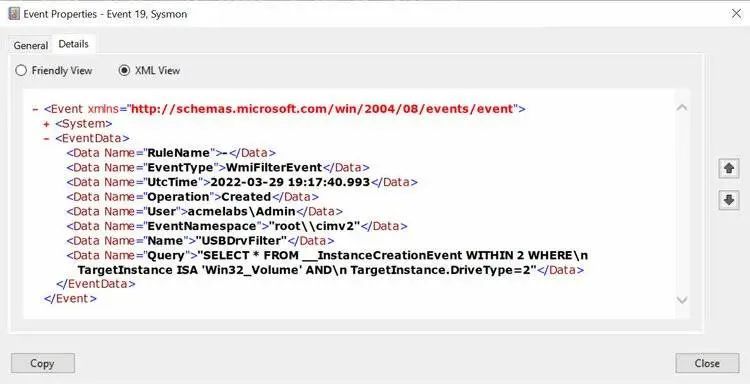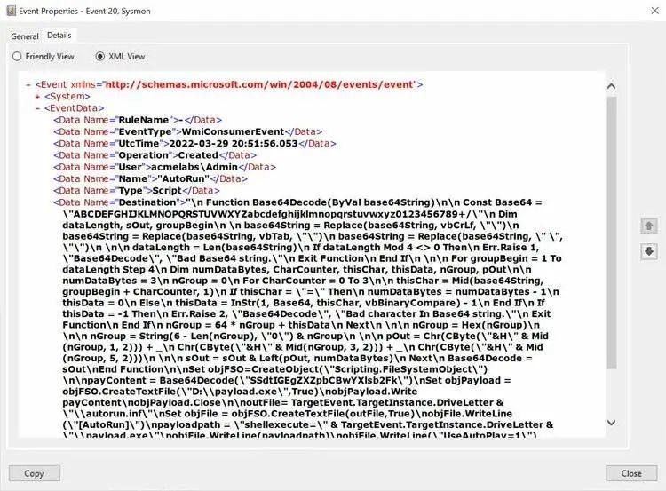 Sysmon将把操作记录为事件编号20, 并将包含来自行动标牌消费者的完整脚本 。