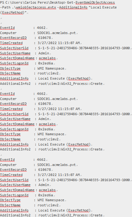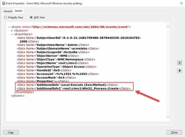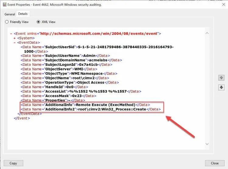 当我们检查保安的日志时,我们看到我们会查看4662事件的身份证明WMI将是目标服务员。事件发生时的命名空间和发生时的用户环境将列入事件。在添加信息字段中,输入我们会查出是本地还是远程的 名字是什么
