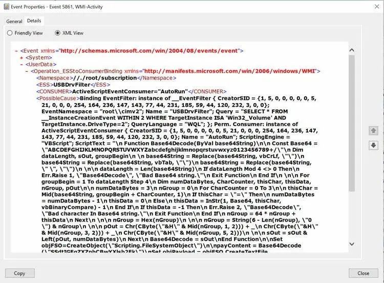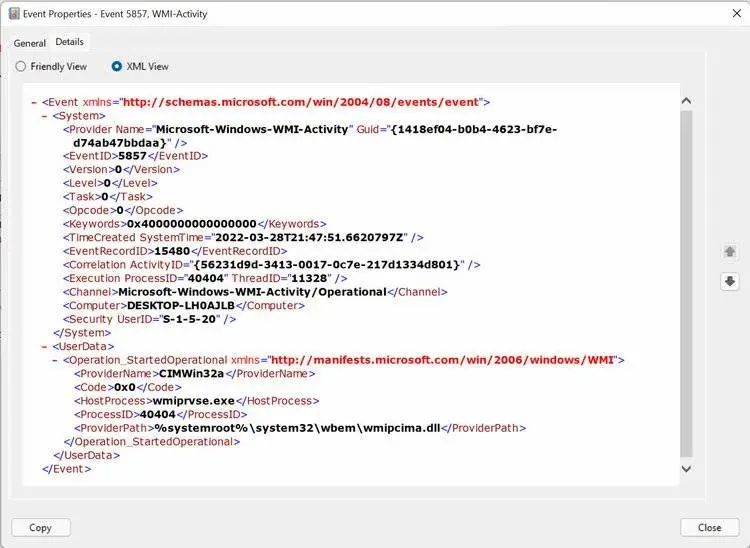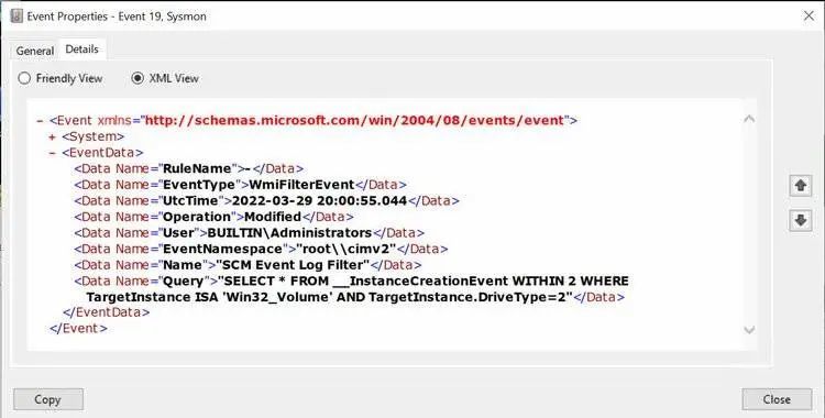 当在WMI CIM数据库中生成 Binder 实例时,使用 _EventFilter 和任何消费者类型对象来创建持续事件,如果下列个人违约,则没有必要在Microsoft-Windows-WMI-activity/Operational 中为 ID 5861 设置事件日志条目,以便进行任何审查。如果任何组成部分类别示例被更改,该活动也将以修改的方式加以发展。即使在“用户数据”元素内,它也可能是子元素的来源,活动还将包括永久对象的所有信息。