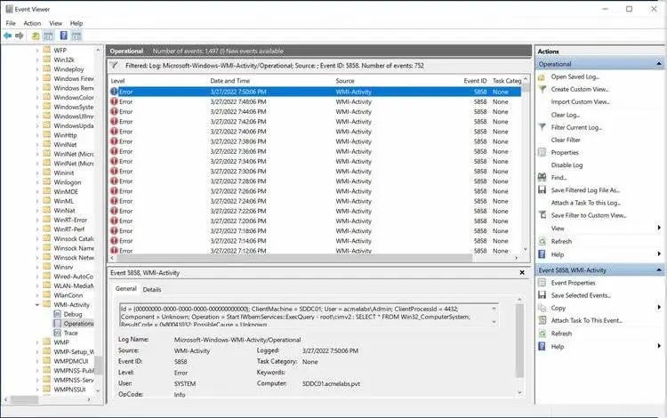 Microsoft-WMI-活动/组织日志默认情况下,Windows记录所有与WMI有关的操作问题。事件编号是58585在Windows正常功能中,它还受到操作系统安装的软件的影响。错误的数量很高。如果SIEM系统允许您在传输前过滤日志, 请这样做 。这将有助于改善所传送事件的字母对音频比率。在下图中,我们可以在我的实验室VM上观察错误数量很高。