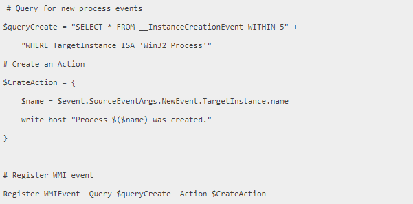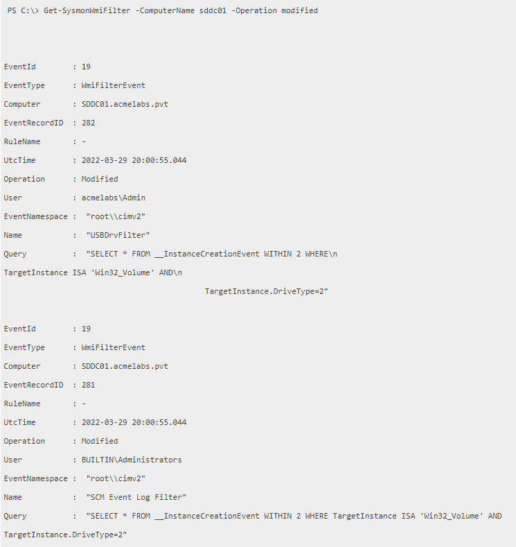 PSGumshoe Powershell 模块在检查Windows 和 Sysmon 造成的 WMI 类型事件时给了您很多自由。 您可以在 Powershell 图书馆和 GitHub 上找到它 。