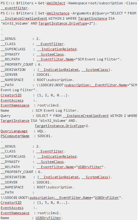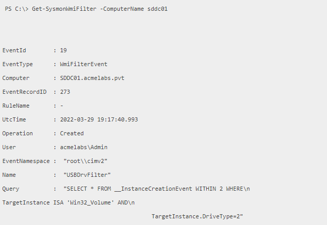 PSGumshoe 包含一个设置的sysmonwmfilter命令, 允许我们查询此事件, 并将结果作为对象返回 。