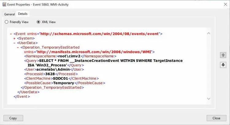 一些参与者已开始利用虚构事件消费者。它们符合C++、Net、WSH和PowerShell。它们使WMI事件过滤器能够启动特定应用程序的活动。最大的优势是,我们可以使用用来创造临时活动的同样词汇。不仅仅是 Windows 脚本主机和命令行工具。为了跟踪这些事件,我们可以使用第5860号事件编号。一旦申请登记了消费者活动,事件就被创建了。Sysmon没有测试这些事件。