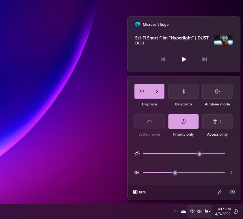 Windows 11的操作中心位于右下角。我的Windows 11行动中心 组织所有的东西。而不是分散在 Windows 10 的许多任务栏图标中,我觉得这一点很棒,然而,它并非没有缺陷;在Windows 10中,不同的符号增加了信息传输方式的数量。例如,音量滑动器确定使用哪一种音频设备。