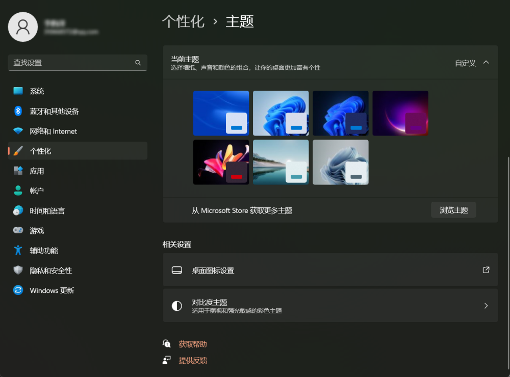 Windows 11和Windows 10一样,支持自定义主题。导航到"个性化>主题"会显示大而生动的图标,告诉你已安装的主题。你甚至还能在Microsoft Store中获取更多主题。