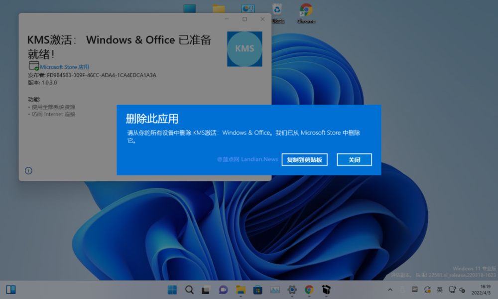 当然,在被下架之后,“KMS激活:Windows & Office”软件的离线版也无法使用了――微软系统会禁止软件启动,并提示用户应该删除它。