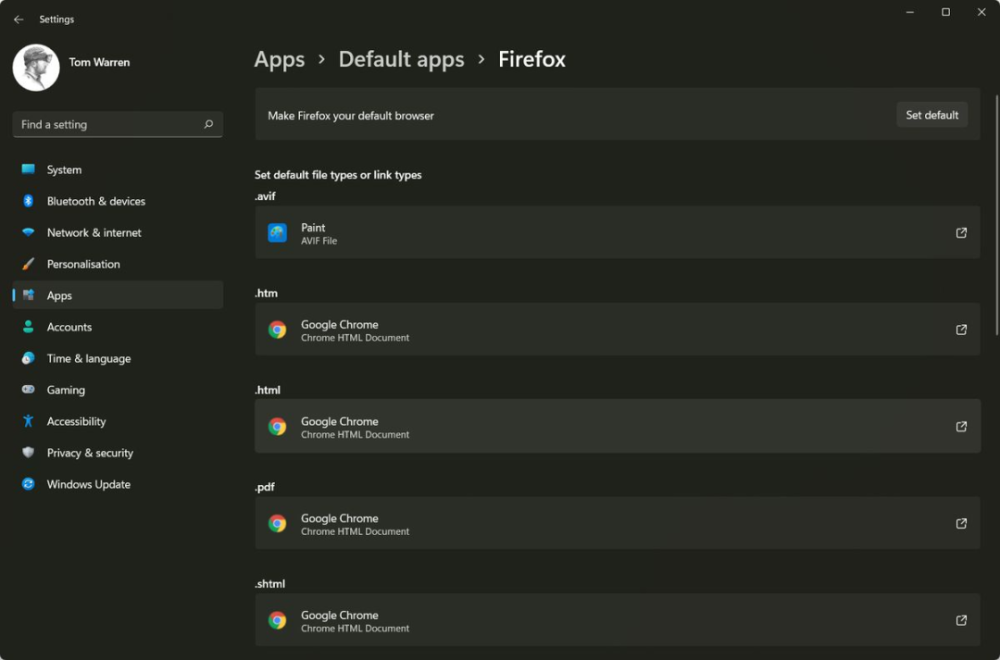 另外,微软用 Windows 11 改变了默认程序的分配 。这意味着用户必须用文件或链接类型设定默认值,而不是单开关。在谷歌铬,这包括修改 HTML、 HTML、 PDF、 SHTML、 SVG、 WEBP、 XHT、 XHTL、 FTP、 HTTP 和 HTPS 的默认文件格式。