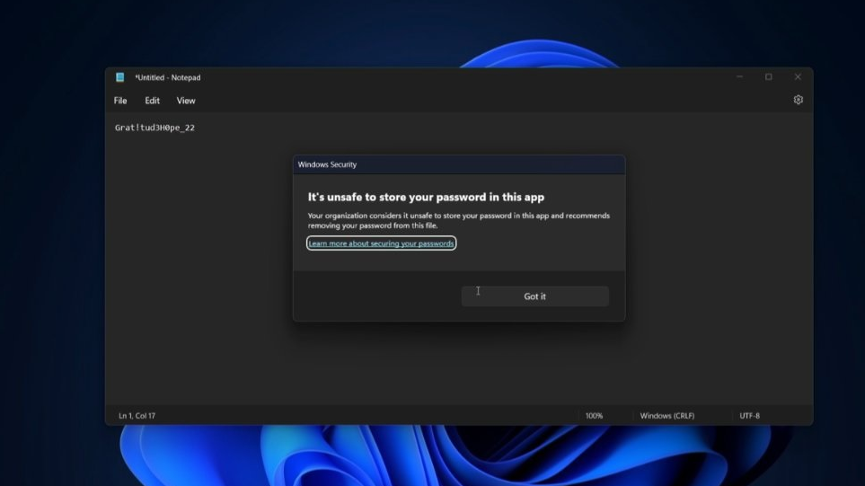 Win 11 新功能:随意将密码存储在应用程序中会发出警告