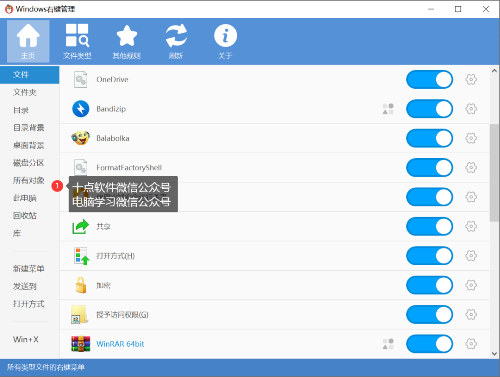 程序功能非常有效地包括文件、文件夹、目录、背景、桌面背景、磁盘分区、所有物体、计算机、回收站、图书馆、新菜单、发送、打开等等。
