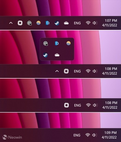 据Neowin称,整个隐藏的任务栏图标的功能将包含在Windows 11 22H2或官方版本2022中,只有系统一级的输入方法、网络、数量、日期等将予保留。